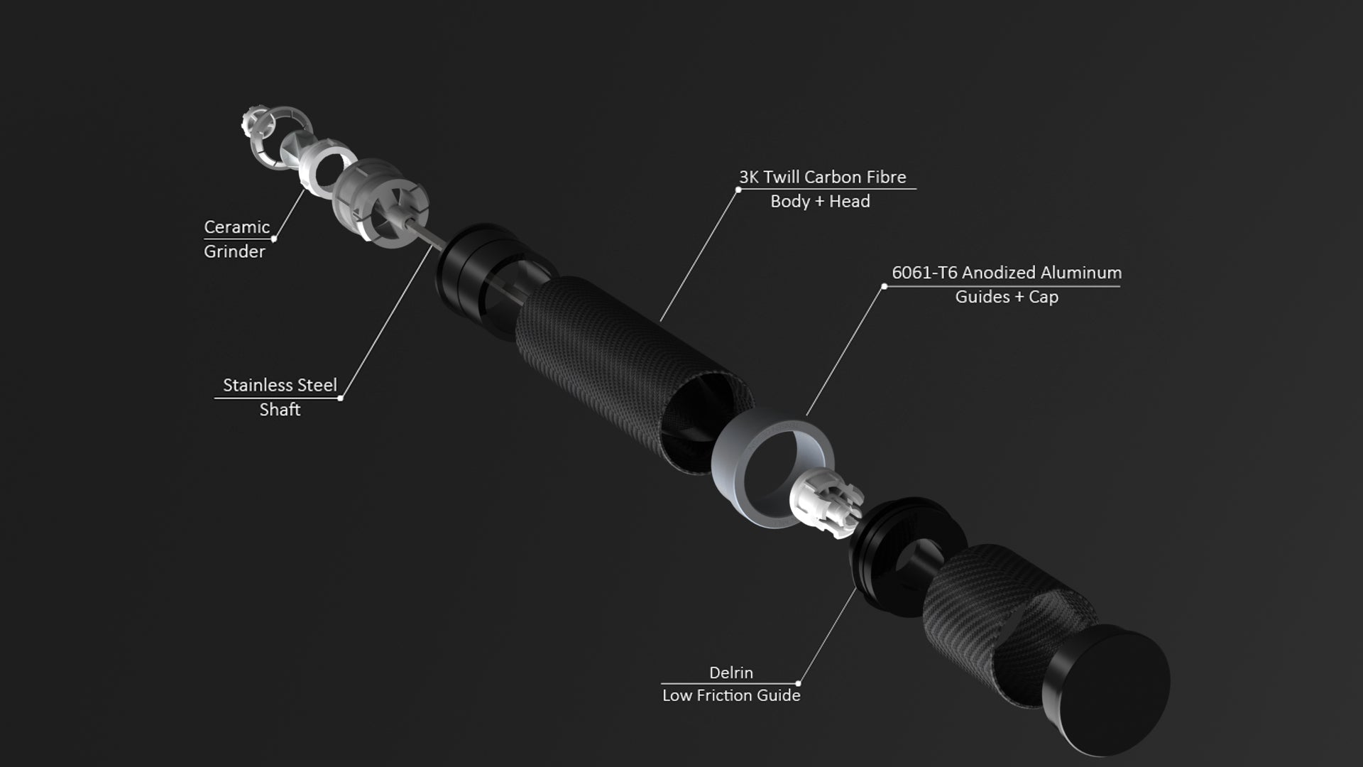 Complimenting its clean, minimalist design, the main housing and grinding knob is made with long lasting carbon fiber. We've integrated machined billet 6061-T6 grade aluminum components, anodized for anti-corrosion, long durability, and great strength to weight properties.